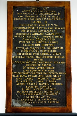 În anul 1938, s-a montat pe peretele de la intrarea principala o placă comemorativă din marmură neagră de marimea 1.50X1m în care se specifică anul dării în folosință, 1938, în timpul regelui Carol al II-lea, numele primului ministru, a ministrului educatiei, a personalităților județene, comitetul școlar, primăria, reprezentată prin primarul Ioan Ceontea și 10 consilieri, arhitecți,constructori etc. În 1941 în timpul dominației maghiare placa a fost smulsă cu țapinele și aruncată. În 1994 prof. Buta Ioan a recuperat resturile plăcii, a compactat-o și în cadru festiv a fost reașezată pe vechiul loc de origine.